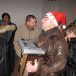 Après un petit voyage dans une joyeuse ambiance, nous avons été débarqué devant la salle des Fêtes. Là, nous sommes accueillis en musique (accordéon ?… euh… presque). Entre le bœuf et l’âne (gris ? euh…un noir, un marron ça fait pas gris ?), une jolie Marie, un gentil Joseph et un berger posent patiemment pour les photos : la crèche est bien vivante ! Tout près Éric se charge de la circulation et des véhicules et des piétons. Nul ne sortira sans avoir tout visité, Éric veille.